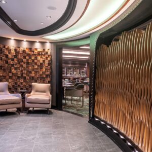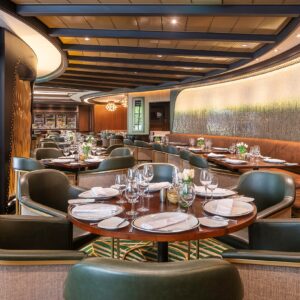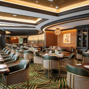The project was to create a new direction for Royal Caribbean’s most popular dining venue and redefine the traditional ‘steak house’ look. The design of this 200sq m restaurant subtly evokes images of pastures in the fabric colors, carpet design and tile work. It references fire in the custom entry screen and wood block wall feature. And sets it all off in natural hides and burnished gold accents.