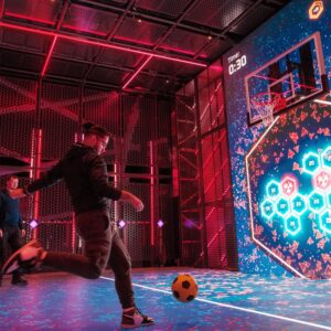 By day, Glow Court can function as a multi-use sports court. The bespoke manufactured outdoor tiles provide digital overlays for popular football and basketball drills, with other high-energy, competitive socialising games pre-loaded onto the court; these can be switched at the touch of a button. With more games in development, this keeps the experience refreshable and repeatable for passengers, keeping them coming back for more.